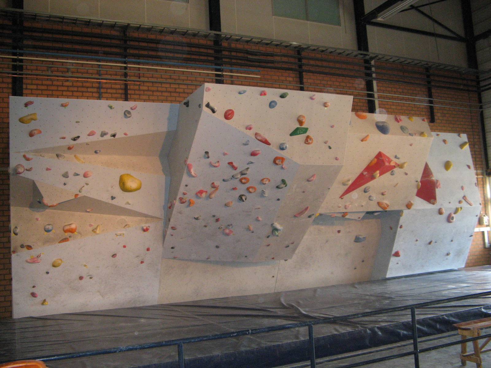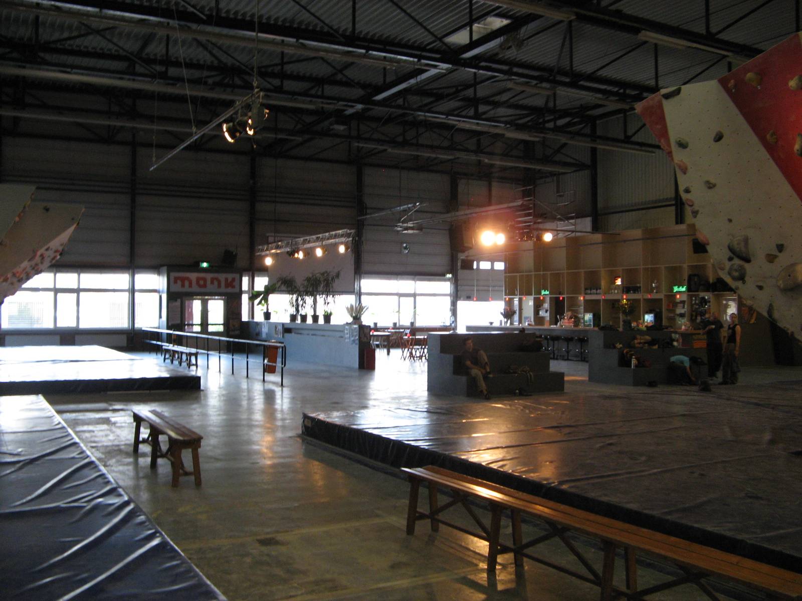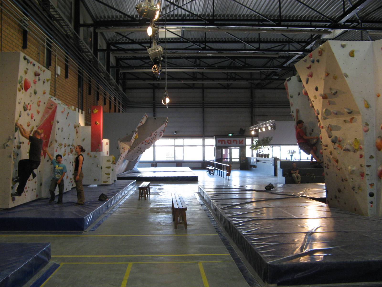 Bahsettiğim gibi Monk sadece bouldering üzerine yoğunlaşmış bir salon. 3 tırmanıcı ortak tarafından 2008 yazında yapımına başlanıp 2008 ekimde hizmete girmiş. Bunlardan biri olan Joris ile ufak bir sohbet yapıp merak ettiklerimi ve detayları ondan öğrendim. Yaklaşık 1500 metrekare alan ile Hollanda’nın en büyük boulder salonu olduğundan emin, Avrupa’nın da sayılı salonları arasında, fakat kendisi rakamlar ile pek uğraşmıyor. Alanda boulder yapılabilecek 7 ana blok var. Bunlardan biri yarışma duvarı, bir tanesi çocuklar için kolay ve eğlenceli bir duvar, bir diğeri ise tanımlı rotaların bulunmadığı tamamen tutamaklarla dolu olan antrenman duvarı. Bu blok diğerlerine göre daha uzun, burada dayanıklılık çalışabilir veya arkadaşlarınızla kendi rotalarınızı yapabilirsiniz. Diğer bloklar ise çeşitli zorluk seviyelerinde renkler ve numaralar ile tanımlanmış rotalar içeriyor. Fransız sistemine göre 3 ve 8b arasında 12 ayrı renk ile tanımlanmış zorluk seviyesi ve her seviyede yaklaşık 20-25 boulder bulunuyor. Bazı derecelendirilmemiş rotaları ve kendi yaratabileceklerinizi de sayarsak, rota olanağı sınırsız. Tabii ki dönem dönem yeni eklemeler ve revizyonlar da yapılıyor. Ayrıca salonda sadece kampüs için hazırlanmış bir blok ve bir adet gevşek ip (slack line) de mevcut.