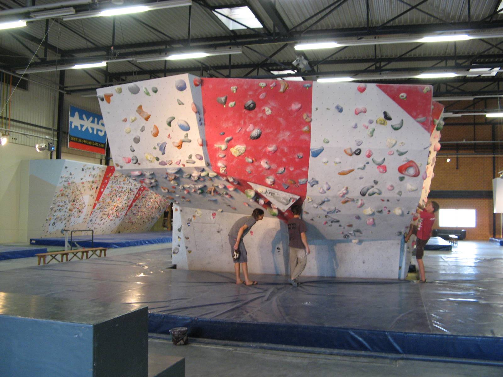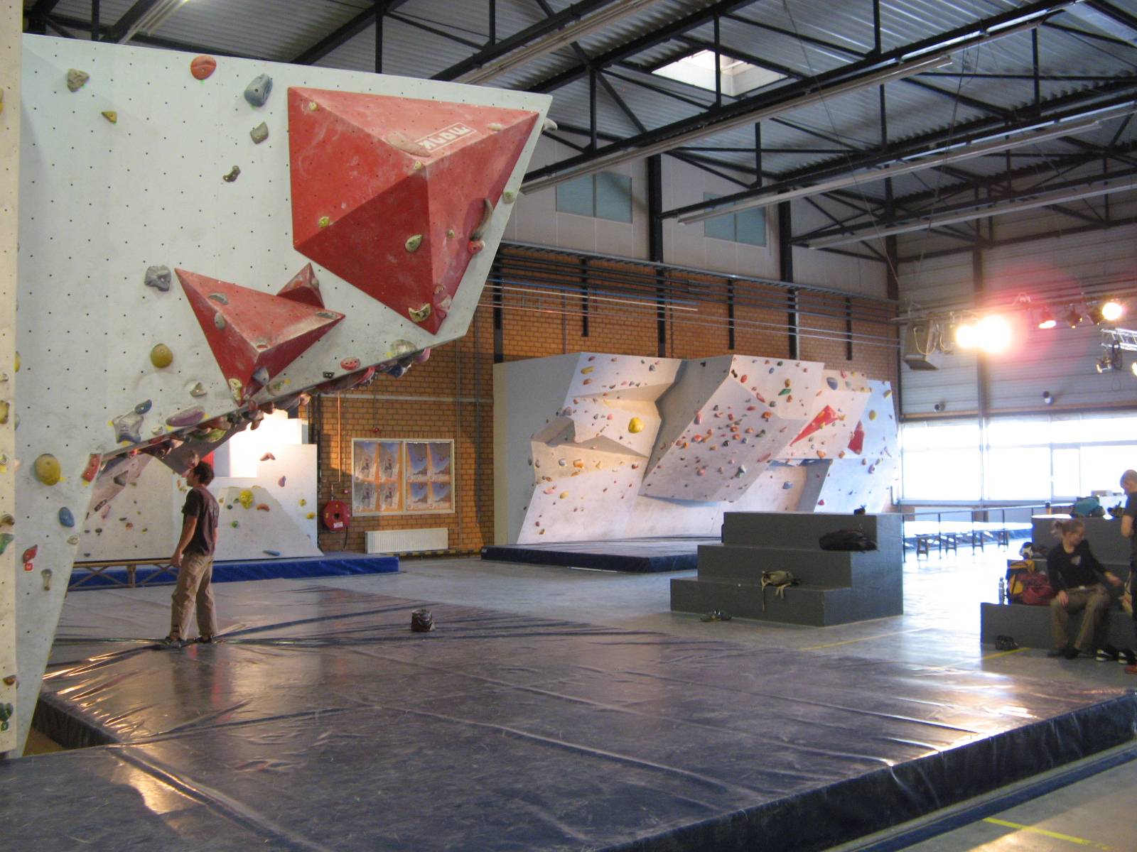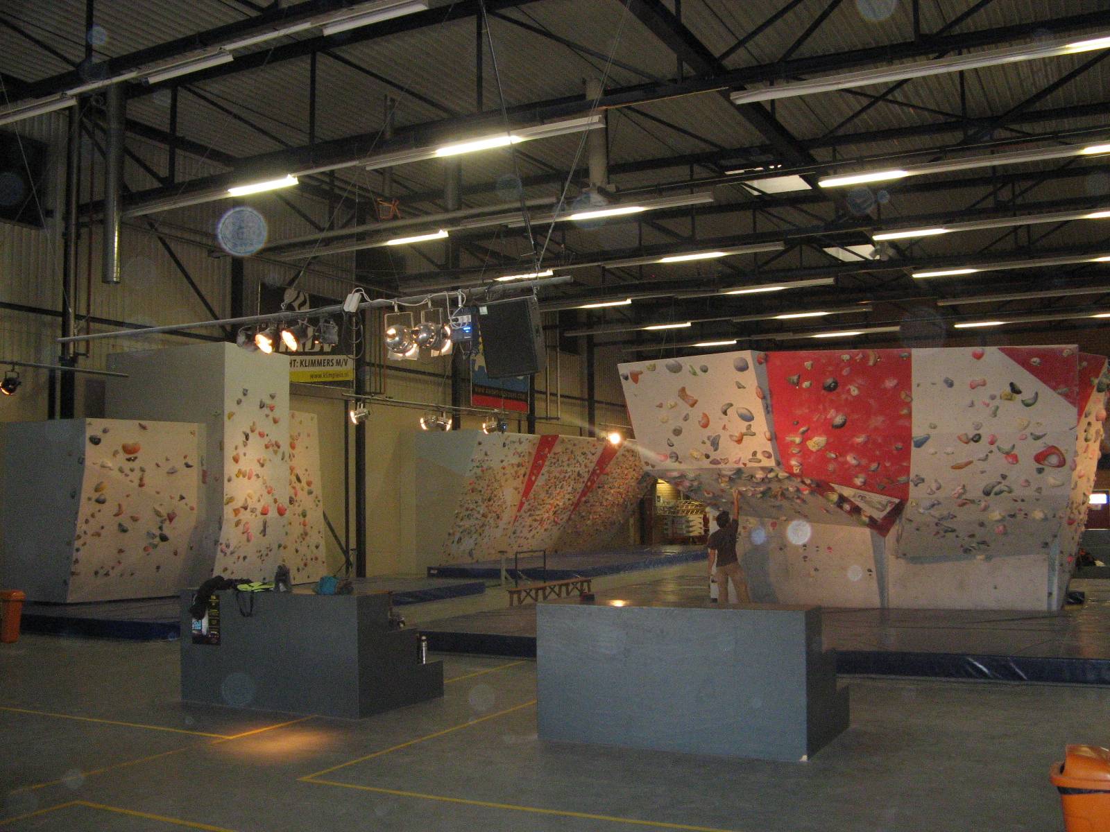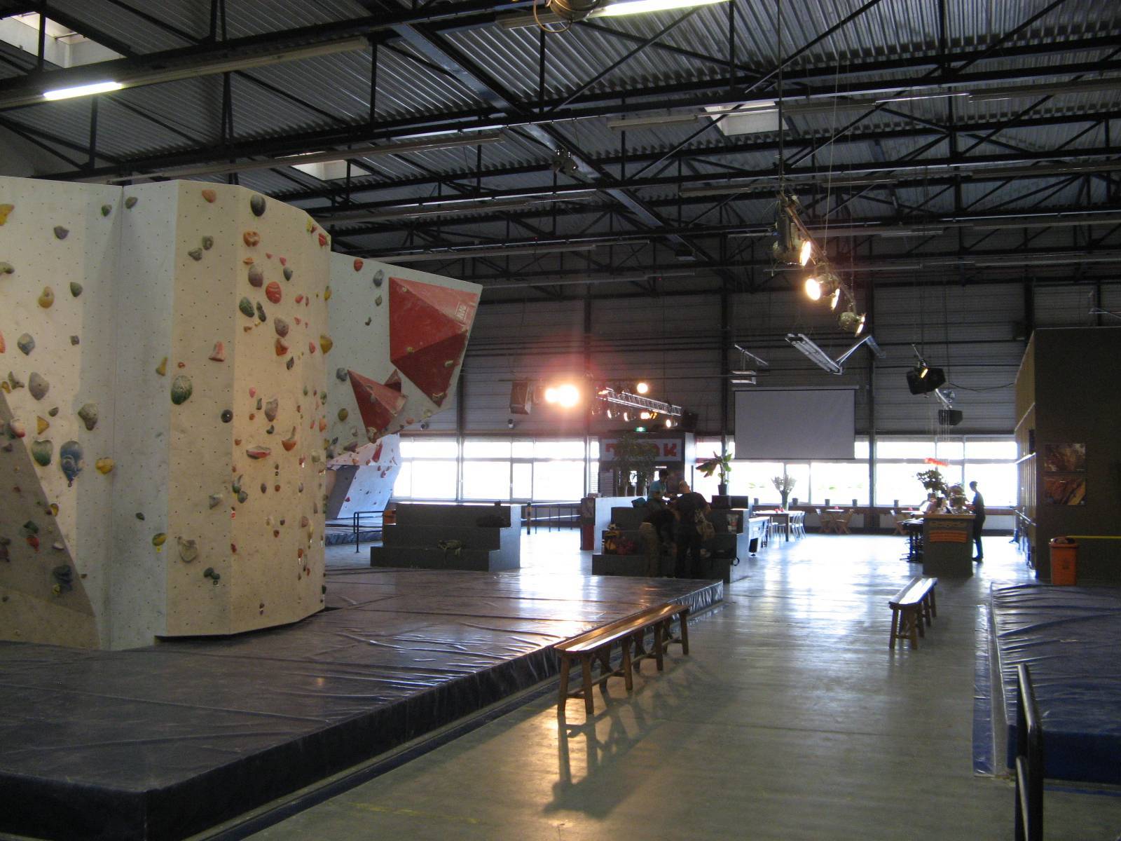 Diğer ayrıntılara gelirsek, soyunma odası, duş ve diğer tüm imkânlar mevcut. Hatta salonun çok güzel bir barı ve sürekli tırmanış filmleri dönen koskocaman bir barkovizyonu bulunmakta. Sadece bu ikisi bile bizim hayallerimizin ötesine geçiyor :). Bu imkânlarla Dünya kupasının Haziran ayağı burada düzenlenmiş. Ayrıca ulusal takım da antrenmanlarını burada yapıyor. Daha önce Dave Graham’ı ağırlamışlar, yakınlarda da Chris Sharma’nın katılacağı bir söyleşi ve dia gösterisi düzenliyorlar. Bunun dışında bölgesel ve ülke çapında yarışmalara ev sahipliği yapıyorlar.