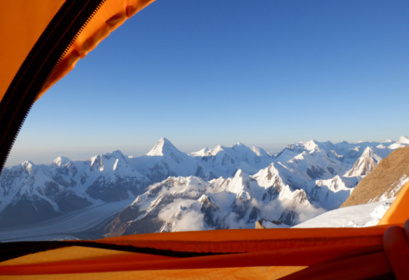 Rutine döndü sabah açık ve çok soğuk havada uyan sıcak tulumdan çık (bu zaten doğum gibi), ocağı yak, kar erit, çay yap, kahvaltı yap, çantayı topla, elini ayağını dondurmadan çadırı topla, kemeri giy, kramponları tak, ağır çantayı sırtlan (ilk başta 25kg kadar) ve tırman. O gün de aynı rutinle 07.00 gibi yola çıkıyoruz zira güneş ancak ısıtıyor. Kayalıkları bitirip bir 100m daha çıktıktan sonra vardığımız sırt 6900m irtifada. Sırtın Çin tarafına geçip 250m kadar Pobeda yönüne yürüdükten sonra geniş alana çadırlarımızı kuruyoruz. Aslında çok rüzgar alacak bir alan ama hava durumuna güveniyoruz.Buradan Pobeda yakın ve alçak görünüyor ama alıştığımız kütle algısının çok dışında ve ona yaklaşmak için 7000m’de 4,5km bir travers yapmamız gerekiyor. Burası sert havada tam bir cehennem, dönüşte bunu anlayacağız.